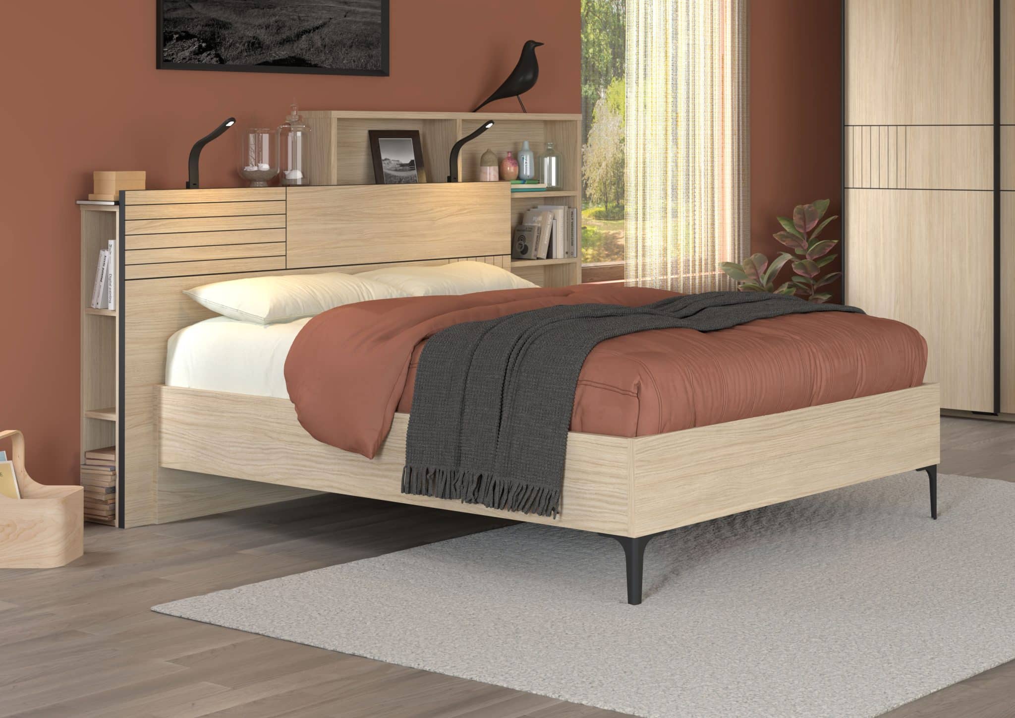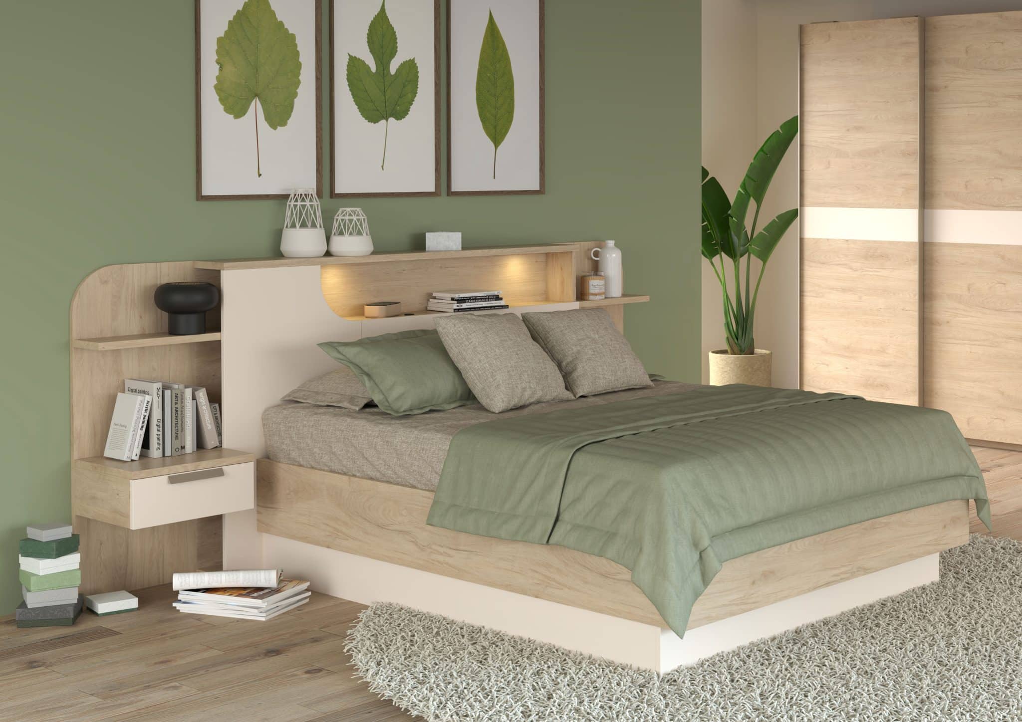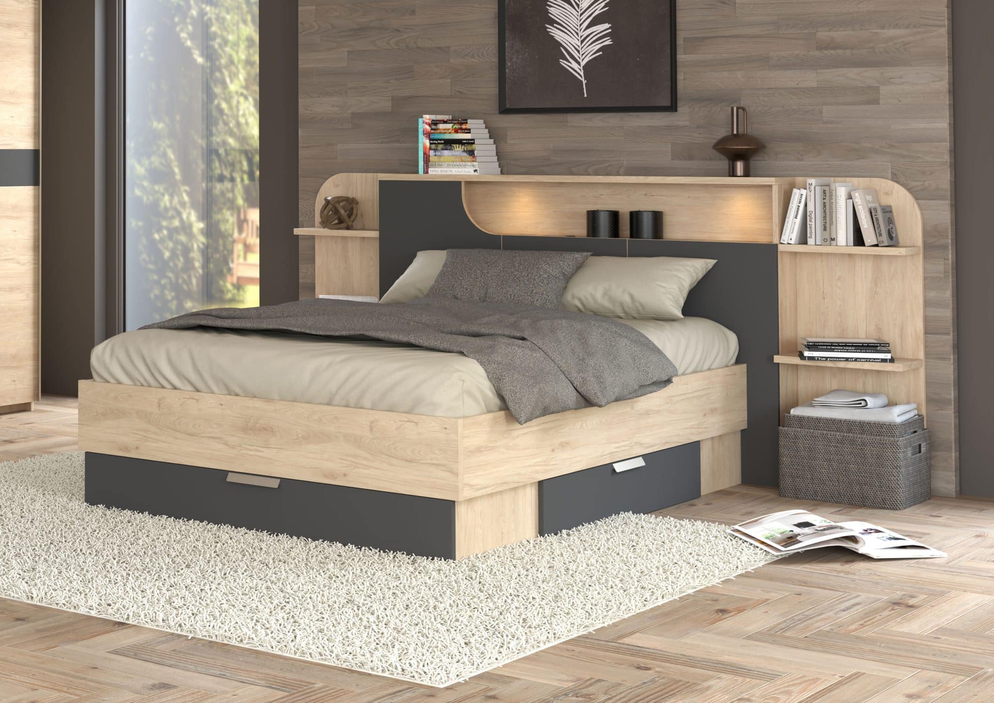 Les versions avec rangements sont parfaitement intégrées dans le dessin du lit : les façades restent alignées, les poignées se font discrètes et l’ensemble conserve une esthétique nette et contemporaine.