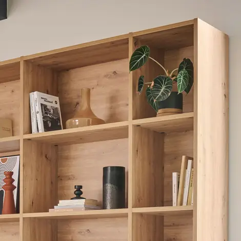 Son design épuré et ses lignes sobres lui confèrent une allure résolument contemporaine, sublimée par un coloris bois chaleureux. Parfaite dans un salon, un bureau ou une bibliothèque familiale, elle permet de structurer un mur avec élégance tout en offrant une capacité de rangement généreuse et fonctionnelle.