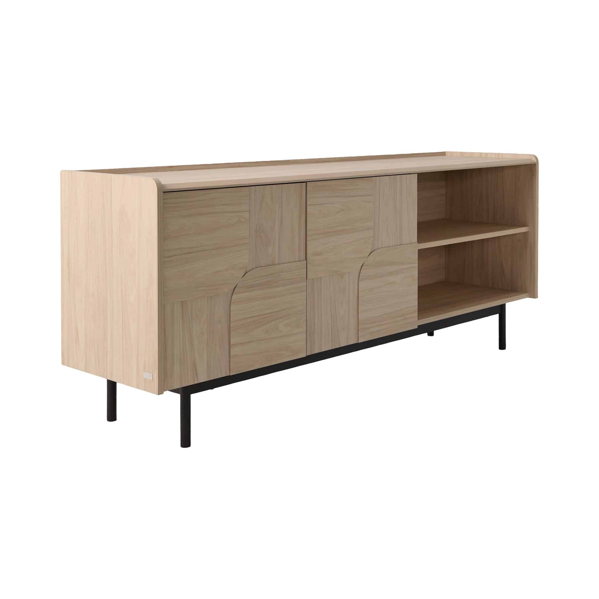 Fabriqué à partir d’un mélange harmonieux de métal noir et de chêne blanchi, le buffet Mila CAMIF combine avec subtilité influences rétro et modernité pour créer une ambiance chaleureuse et tendance. Ses deux portes spacieuses offrent un large espace de rangement idéal pour votre vaisselle, linge de table ou accessoires du quotidien, tandis que sa niche ouverte met en valeur vos objets décoratifs ou plantes d’intérieur avec élégance.