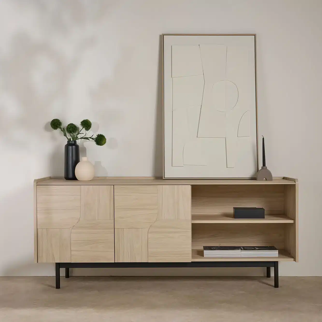 À la fois audacieux et minimaliste, ce buffet contemporain structure votre espace de vie avec style tout en s’adaptant à différentes ambiances décoratives. Facile à entretenir et durable, il s’impose comme une pièce maîtresse de votre salle à manger ou de votre salon.